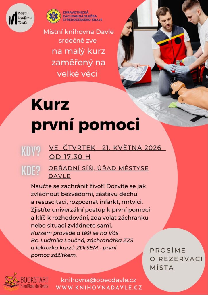 Srdečně zveme ve čtvrtek 21. května 2026 od 17:30 h na „Kurz první pomoci“, kterým provede lektorka a záchranářka